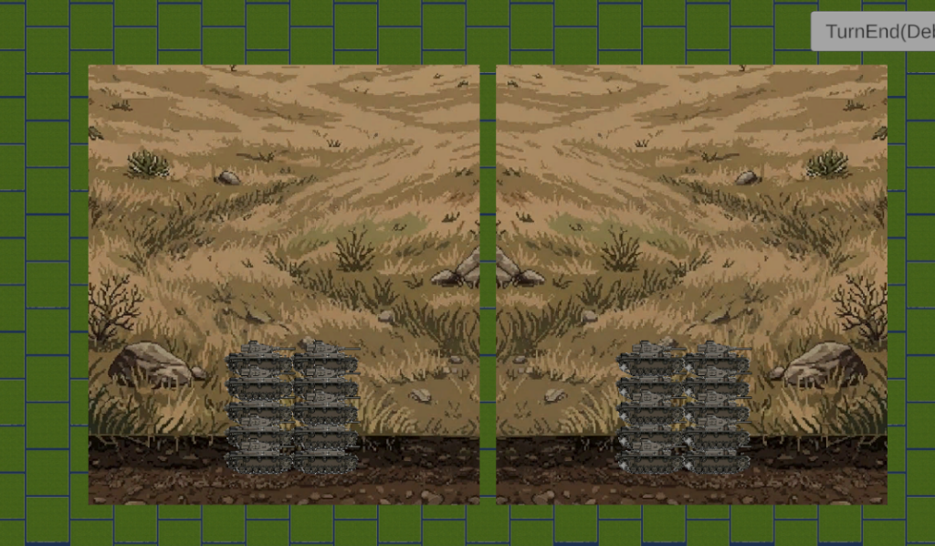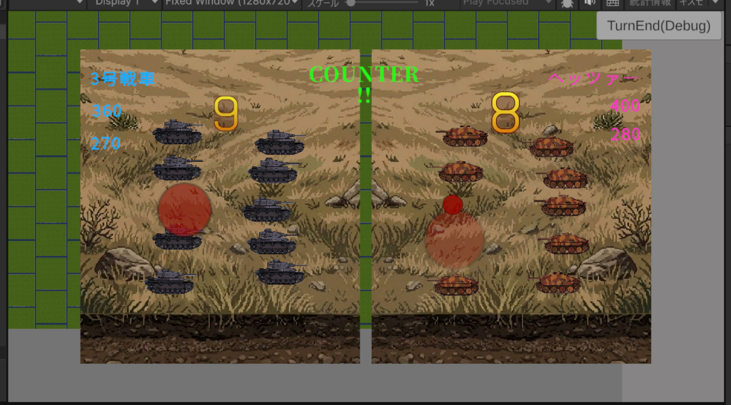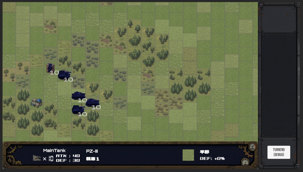 戦術画面も早期に下部パネルは作りだしていますが、右側はすっかすかでターン終了のボタンだけ配置してただ動かせますといった状態。