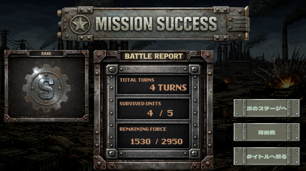 ターン数 → 残ユニット数 → 残戦力値の順に順次カウントアップします。