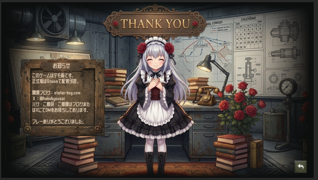 スクロール完了後はFinalViewがフェードインして表示されます。 THANK YOU背景画像にはHLSLシェーダーで周辺減光効果(ビネット)を実装しました。 上下は狭く、左右は広めに黒くフェードする設定です。