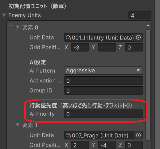 StageDataのEnemySpawnInfoにaiPriorityフィールドを追加したので、 ステージデザイン時に特定のユニットを優先的に動かす制御もできます。 デフォルト値は0で既存ステージへの影響はありません。