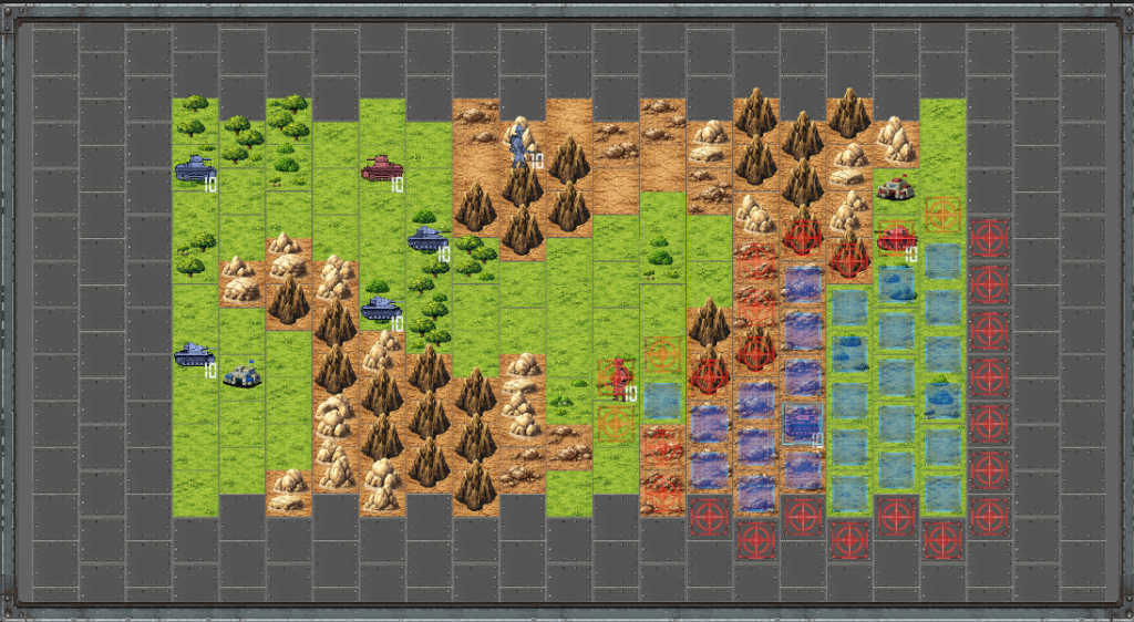 これないと高機動ユニットや長距離砲の範囲がわかりにくいので慌てて実装という感じです。詰将棋的なマップをいずれ作る予定なのでちまちまマス目数えてらんないかなと。