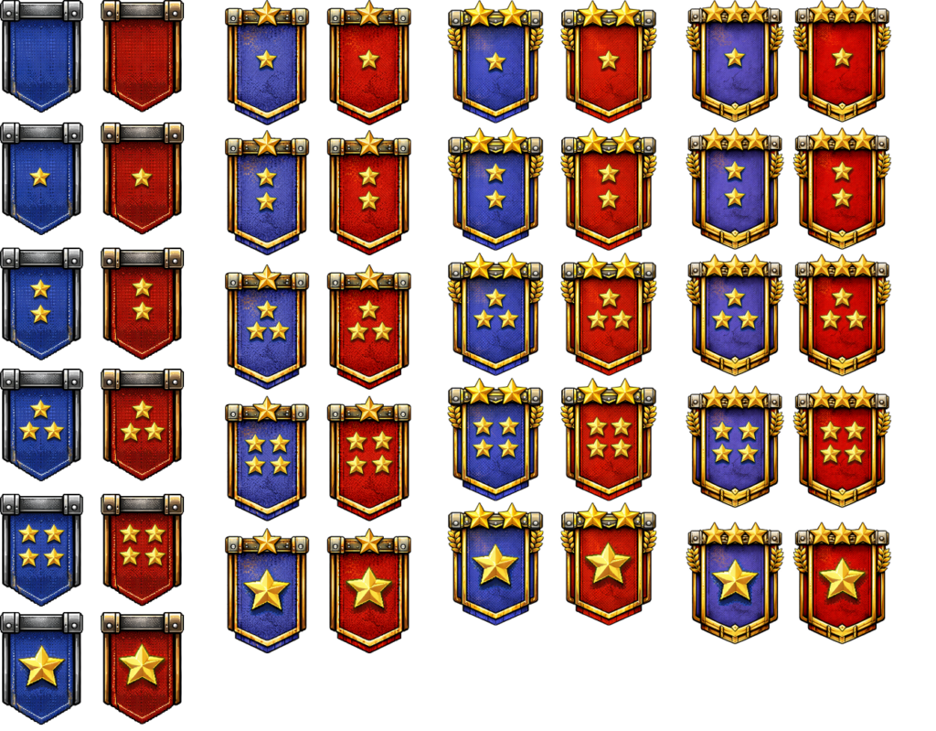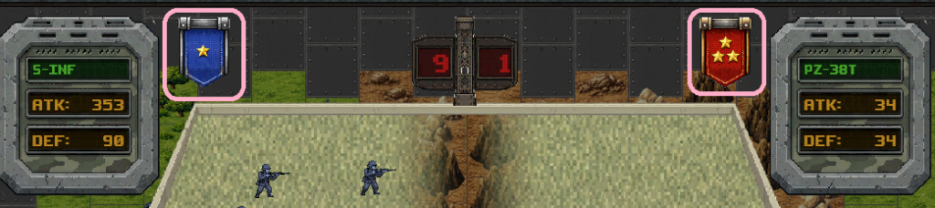経験値は勲章画像で表現しています。味方は青、敵は赤のバナーデザインで、