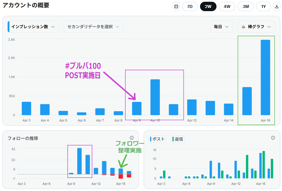 グラフを見ると、4月9日の#ブルバ100実施後にフォロワーが急増し、数日後にインプレッションが落ち込む流れがはっきり確認できます。