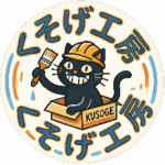 ヘルメットをかぶった黒猫が「KUSOGE」と書かれた箱から絵筆を振り回しているデザインです。